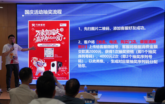 會上,湯科先生對“萬象賀國慶?贏華為 Mate80”線上抽獎活動的參與規則、時間節點等詳情政策進行了詳細宣講。同時,還針對本次會議專屬的多項重磅優惠舉措展開解讀,為核心加盟商提供實實在在的合作支持。政策發布后,現場氛圍迅速升溫,咨詢與參與熱情顯著提升。最終,訂單數量遠超預期。